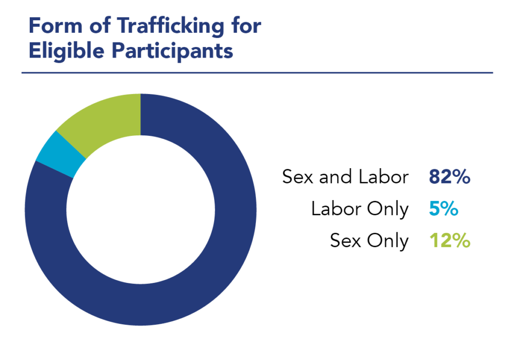 We are also lacking other groups such as males, those who were labor trafficked, and those who are a gender minority. For example, only 2 percent of the sample identify themselves as transgender. Additionally, while the majority of participants (94 percent) reported either being sex trafficked or reported being trafficked for sex and labor, with sex trafficking indicators being the predominant aspect of their exploitation, only 5 percent of survivors reported being trafficked only for labor. While the labor trafficking experiences of those who have also been sex trafficked are important, it is also critical to have a deep understanding of those who have been trafficked for labor only, as this population is traditionally most often excluded from research.