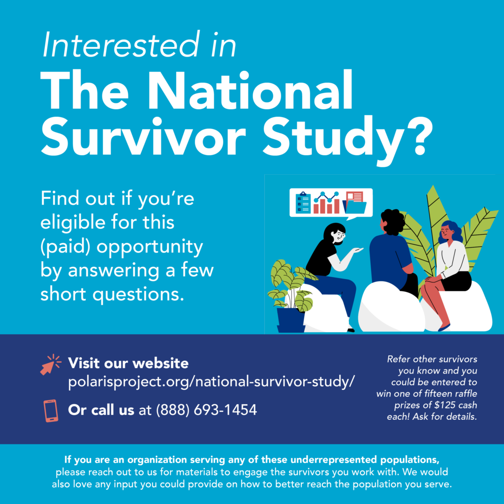 If you have more questions about the current breakdown of the data for the National Survivor Study, please email LIDS@polarisproject.org for more information.