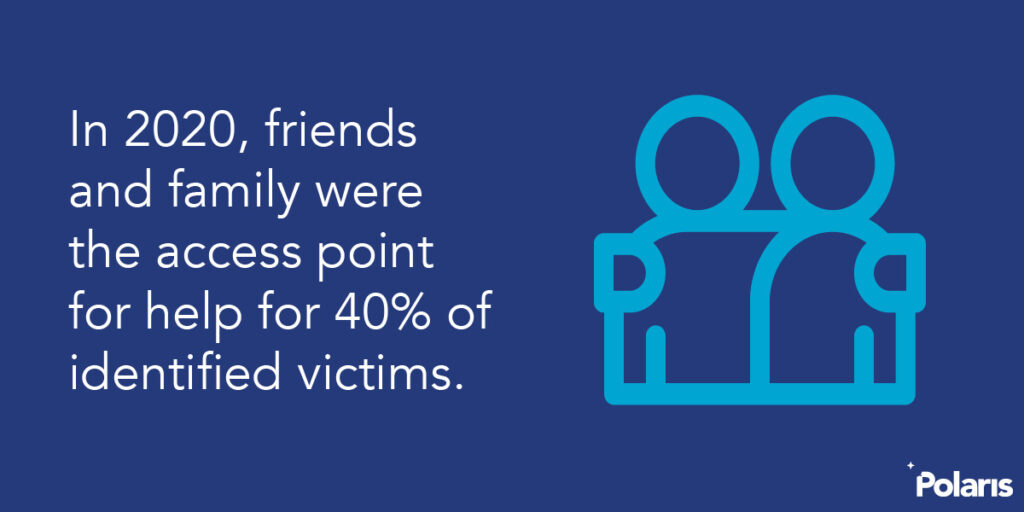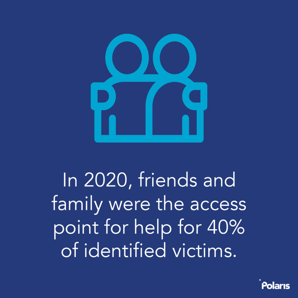 Data from the U.S. National Human Trafficking Hotline shows victims usually know and trust their traffickers. Conversely, friends and family who know something about victims and their situations are also the most likely to be the way they are connected to help.