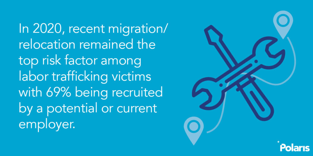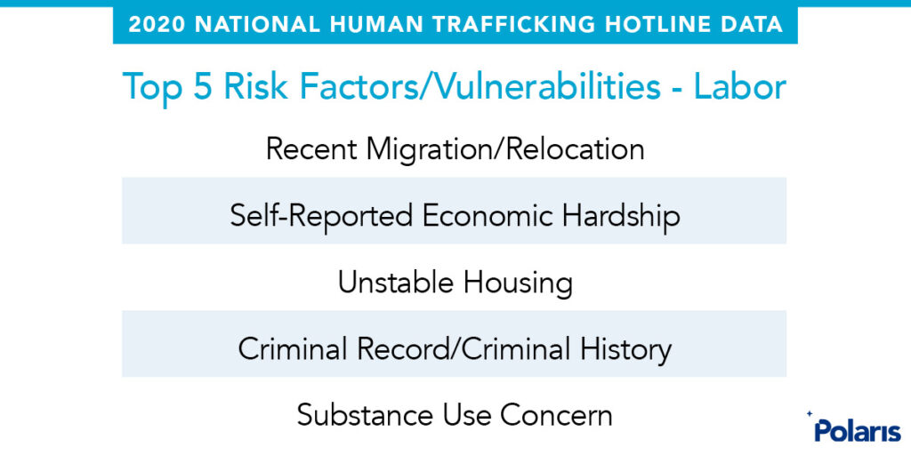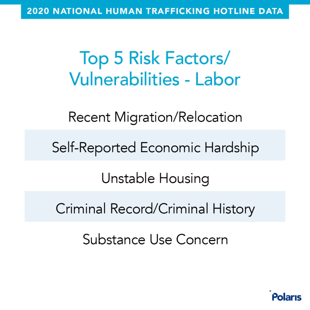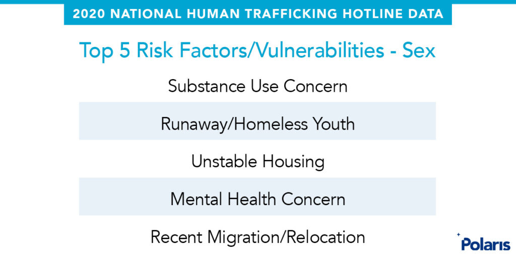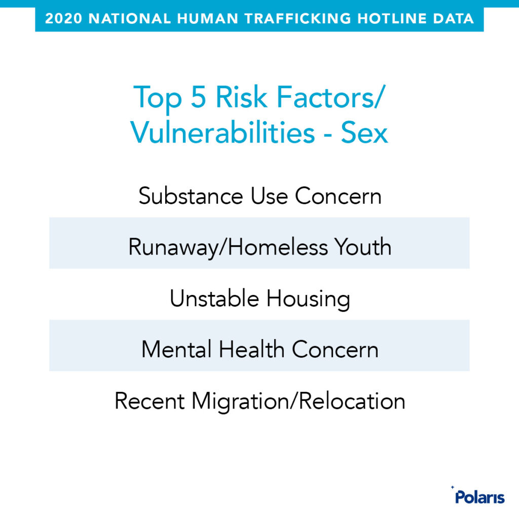 Traffickers prey on their victims’ vulnerabilities. Here are some of the most common sex and labor trafficking risk factors and vulnerabilities the U.S. National Human Trafficking Hotline learned about in 2020.