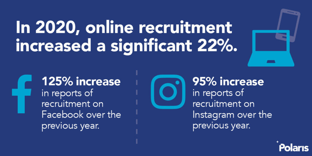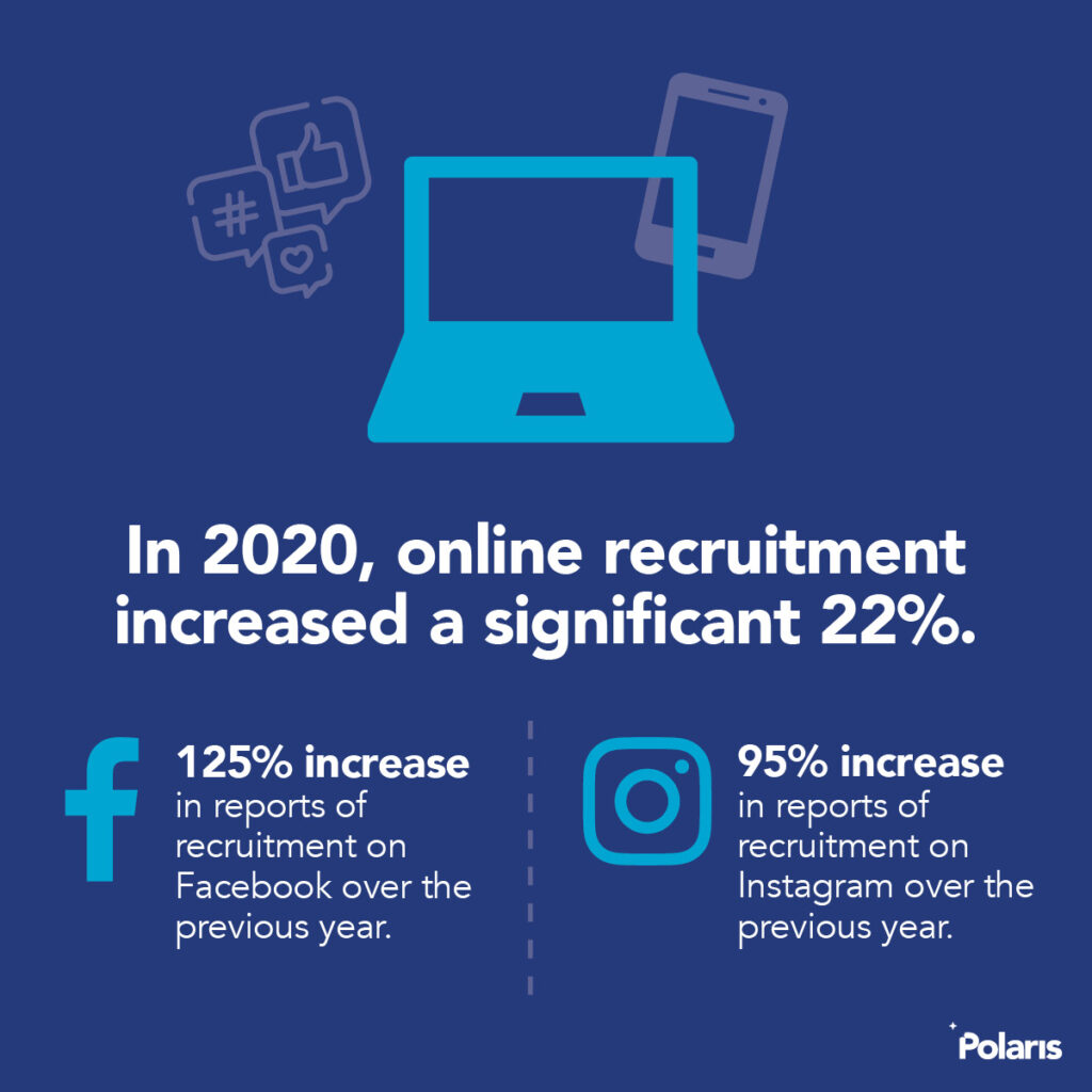 Through an analysis of 2020 data from the U.S. National Human Trafficking Hotline, Polaris found that the Internet was reported as the top recruitment location for all forms of trafficking. Notably, there was a significant increase in the proportion of potential victims for whom Facebook and Instagram were the sites for recruitment into trafficking.