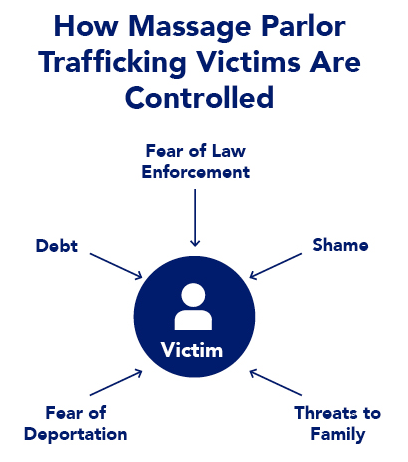 Traffickers have told her that if she leaves no one will help her, that the police are corrupt and won’t listen to her or believe her, that she will be arrested for prostitution or deported, and that her family will be told the shameful story that she is working in the sex industry in the United States, and will be required to pay off her debts. Given this situation, there is no real choice for the victim. Either she stays at the massage business, abiding by the rules set by the trafficker, or risks losing everything.