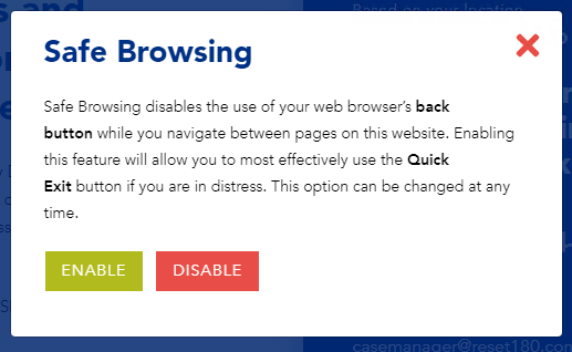 Safety was at the forefront of our planning process. With feedback from GMSD users and survivors, we learned that ensuring a safe browsing experience was critical for the new site. To this end we have instituted two safe browsing tools: the safe browsing toggle, which can be turned on and off, and an effective quick exit button, both of which follow the user as they navigate throughout the site.