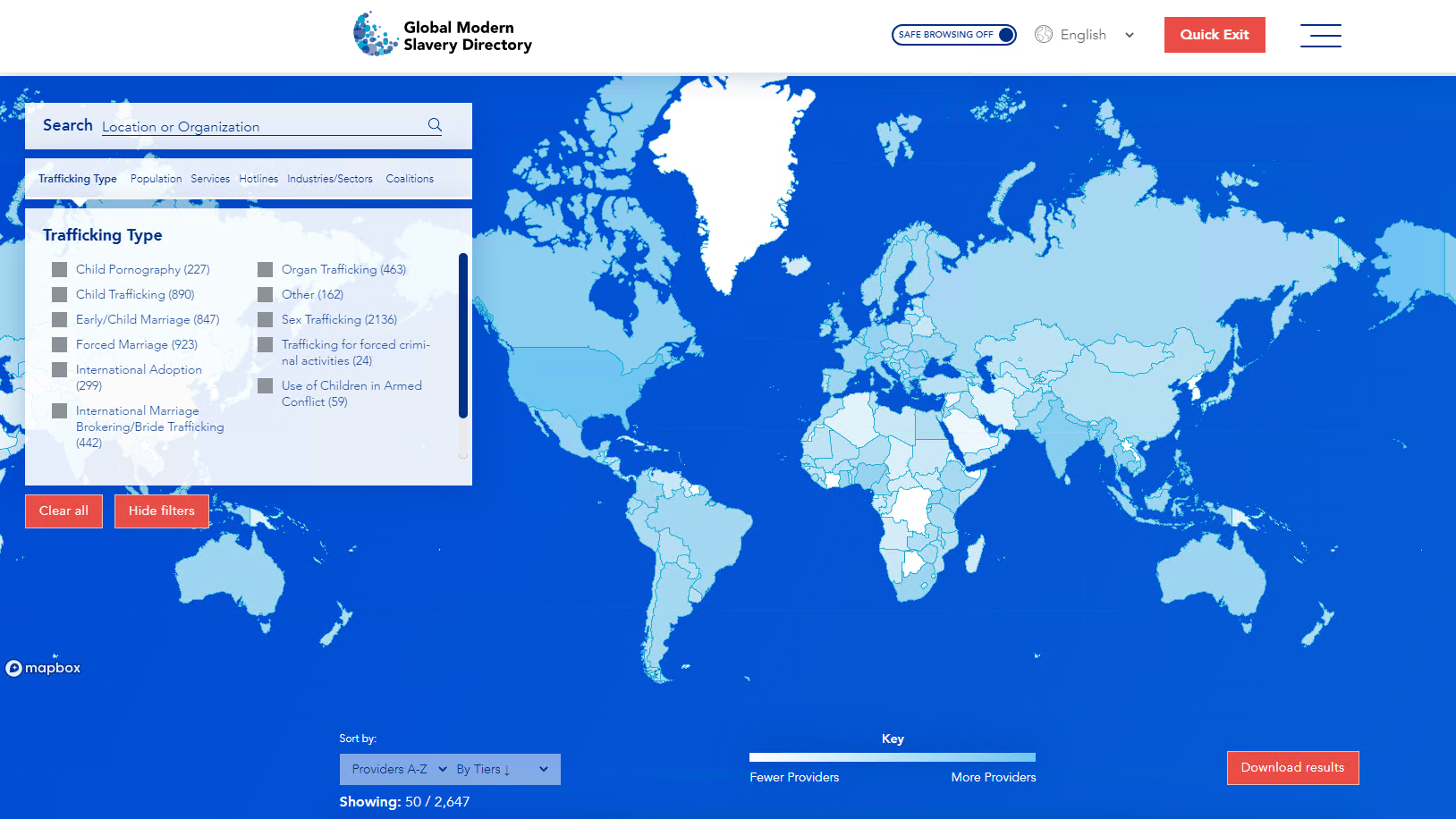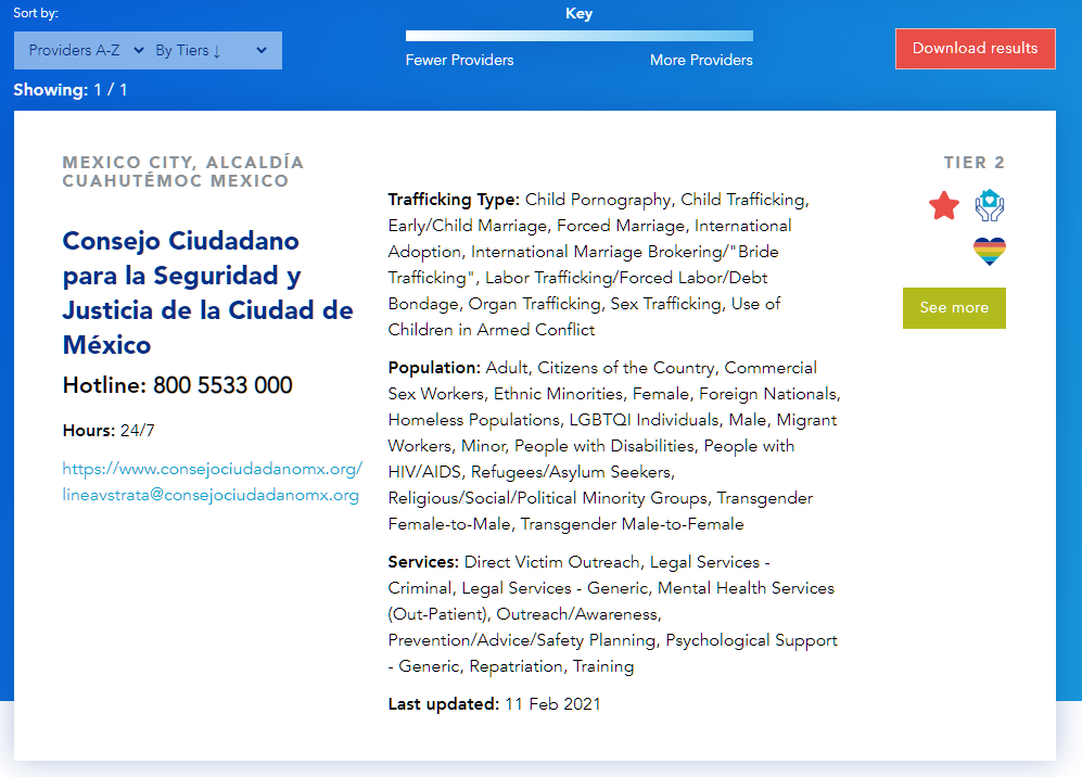 With its more user-friendly and interactive map, you can now visualize the anti-trafficking field through color variants on the map – the darker the shade, the more resources available in that country. The search filters have been updated to include more options and you can download a CSV of all the service providers listed based on filtered search results.