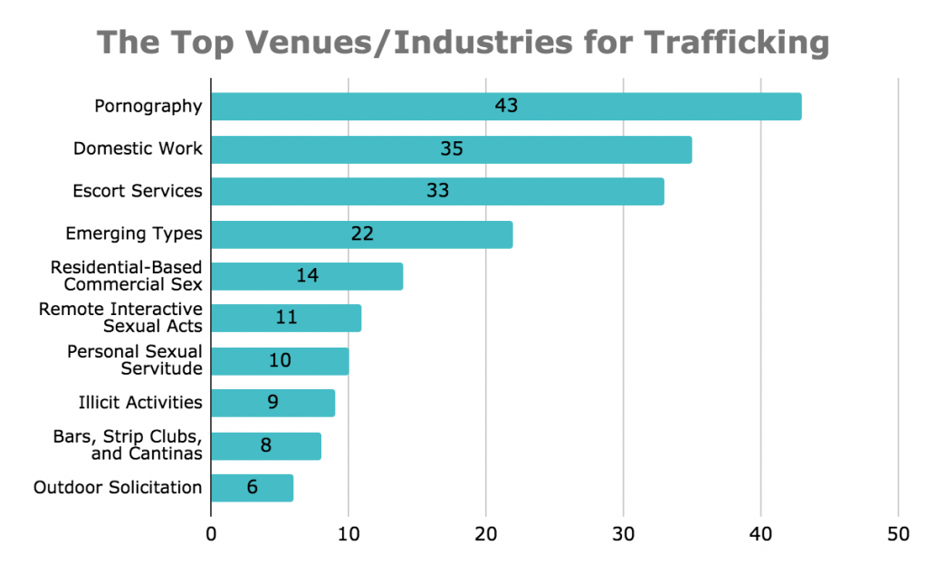 Through data extracted from the Trafficking Hotline situations, we at Polaris are also able to learn more about the top venues and industries for trafficking globally and the top needs identified by international potential victims of trafficking.