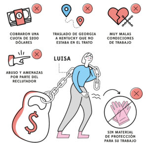 Después de solo una semana recogiendo duraznos, Paul trasladó a Luisa y a sus compañeros al estado de Kentucky para recoger hojas de tabaco. Luisa no recibió guantes de protección y se enfermó al trabajar con las hojas de tabaco. Al pedir ayuda médica, Paul la amenazó con dejarla allí si no se callaba y continuaba trabajando. Luisa no sabía exactamente dónde estaba en Kentucky y tenía miedo de ser abandonada. Cuando Paul le pagó a Luisa y a sus compañeros, había deducciones salariales que no podían entender. Paul les advirtió que si le hacían preguntas a alguien acerca de las deducciones, o pedían ayuda, él se encargaría de que los deportaran a todos.