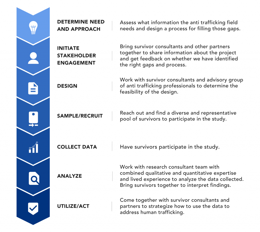 The single best source for high-quality data, information and insights are survivors themselves, acting as full partners in the endeavor, from determining what information matters, to providing it purposefully, and voluntarily. By intentionally engaging stakeholders through the entire process, we ensure we are asking the most relevant questions for anti trafficking, broaden the diversity of survivor participation and thereby improve the validity of the data.
